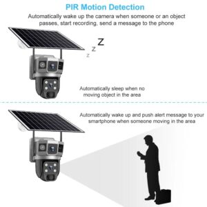 8W+solar panels; 8000mAh built-in battery. Alarm System: Al Human Detection + APp Push + Siren Alarm